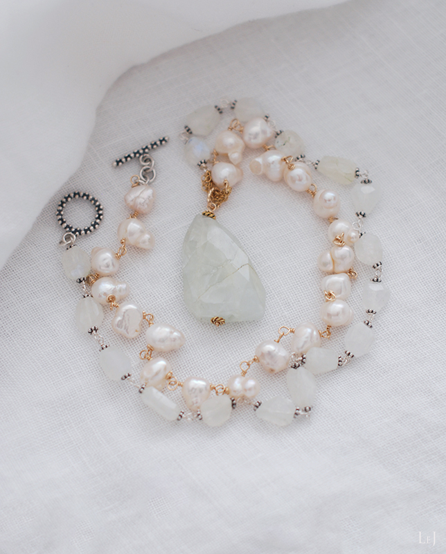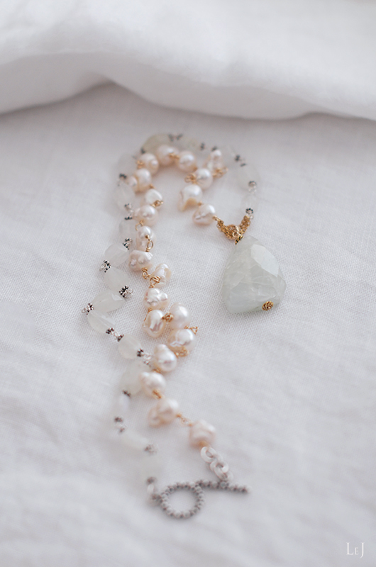 ターコイズやパールとも、よく合わせます。このネックレスのパールは、ブレスレットと同じものをすべて使って作ったもので、ムーンストーン(ホワイトラブラドライト)と合わせ、トップに大粒のアクアマリンを使いました。65cmのネック部分にチェーンで繫いだアクアマリンは34mm×22mmで厚さは6mm。