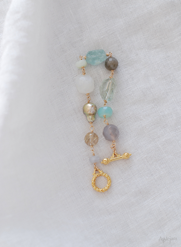 アコヤパール、サファイア、カーフのレザーコードのもの。それから、沢山の天然石を集めて作ったブレスレットが数点ありました。18cmのなかに込める、まるで一つのストーリーのようなものです。