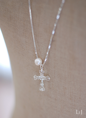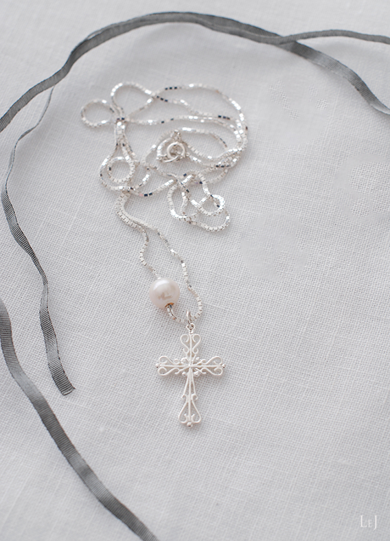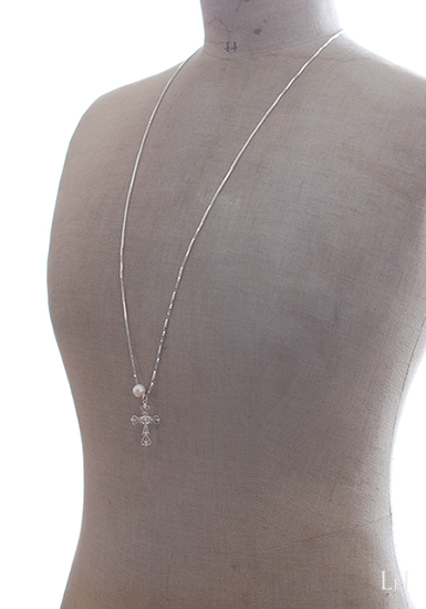 適度な重さできれいなラインを描くチェーン、やわらかで静かな空気感を持つクロスのモチーフとクリーミーホワイトの淡水パールを通して、シンプルなネックレスにしました。長さは82cm。パールのネックレスやシルバーのネックレスとの重ねづけをしてみたり、1点でオフの時間のお散歩に着けて、お出掛け下さい。