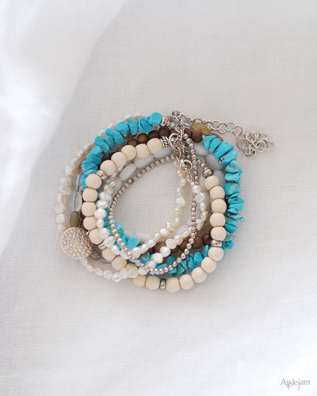 たくさんの種類の素材を使った制作です。でも、考えてみたら、私が使うパーツは定番のように使っているものがとても多いようです。lise は、ネックレスとしてもブレスレットとしても使えるもので、軽い素材感や自然素材の良さを活かしたものに出来ました。