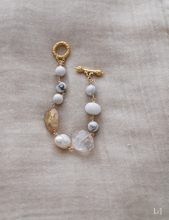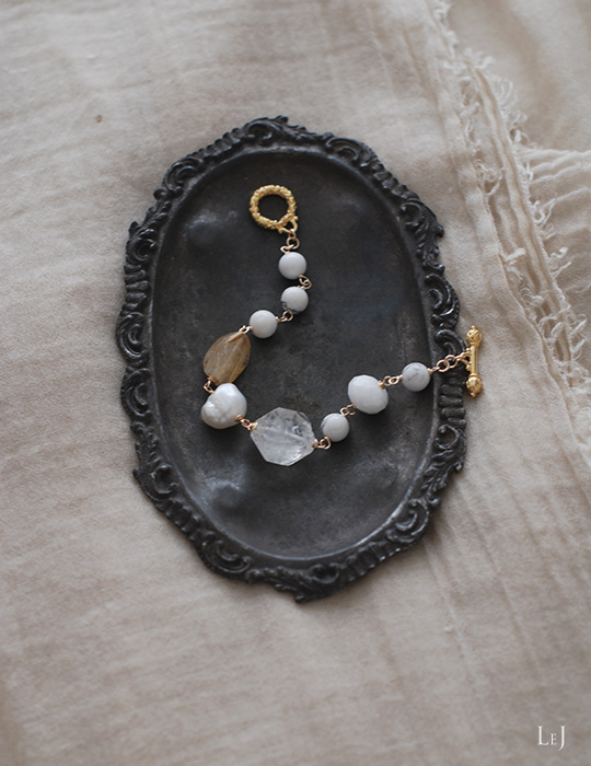 このようなタンブルカットの天然石を集めたブレスレットは、個性が強いように見えて、実はとてもナチュラルで、リスト周りを華奢に見せてくれる役目もします。涼しげな素材は軽やか、冬になればウインターホワイトとしても、とっても素敵なアクセサリーです。また、LeJは、手の動きに困るような素材は使わないよう心掛けています。一番大きなクリアクオーツは、18mm×16mm×10mmです。