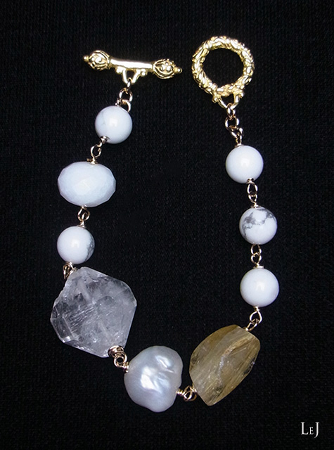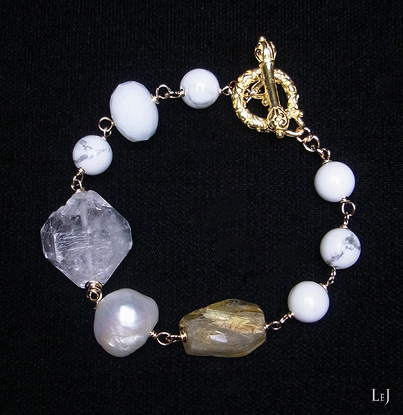 昨日の diary の後半で書いていた、ホーライトを使ったブレスレット Lèa(レア)です。光量がやや足らない画像になりましたが、黒い背景の写真はとてもクリア。ホーライト、ルチルクオーツ、バロックパール、クリアクオーツタンブルカット、とても丁寧で綺麗なカットのホワイトジェイドを使っています。金属パーツは14Kゴールドフィルド、マンテルはヴェルメイユ。全長約18cm。PCでご覧頂けると、 diary の左サイドバーに、flickrに載せた画像が流れて来ています。