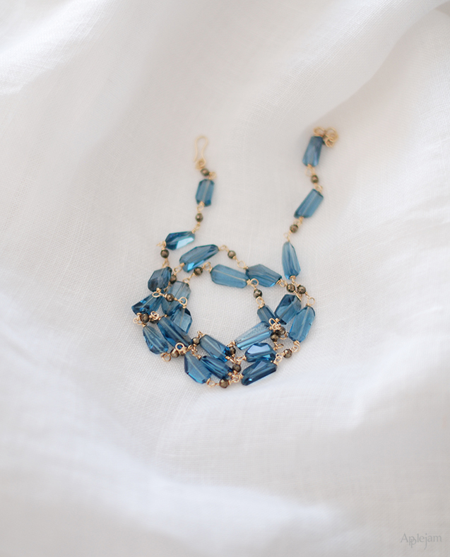 トパーズはとても贅沢な素材なので、思い切った制作でした。パイライトを添えることでなめらかなアールを描けるようにして、同時に、お手持ちのゴールドのネックレスと重ねたり、さらには革のネックレスとの重ねづけなど、カジュアルダウンしてもお着け頂けるアクセサリーにしました。でも、このカジュアルに「ダウン」するというのは、ちょっと違うような気もします。カジュアルはカジュアル、十分素敵なコーディネートです。