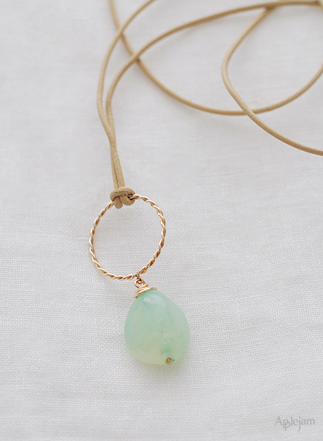カルセドニーも大好きな天然石のひとつで、とくにこの二点のようにネックレスのトップとして使う時には特別に好き、なものを使います。とろりとした印象の天然石に、レザーコードはぴったり。長さも調整出来るようにすることが多いので、ショートにしたりロングにしたり、バッグのハンドルに付けて楽しんで下さっているお客さまもいらっしゃいます。