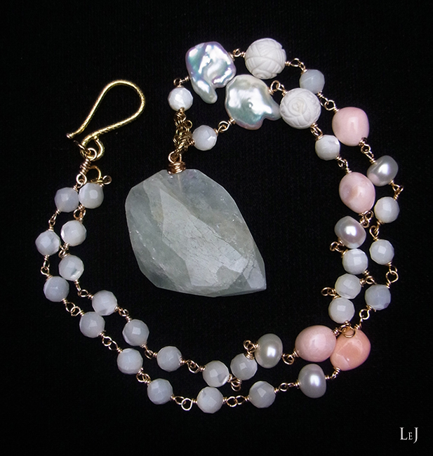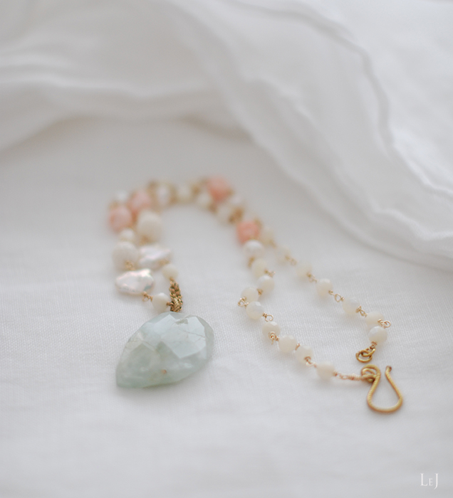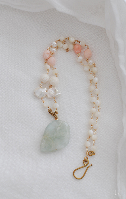 最初に作ったのは、ブレスレットの Emma 。同じトーンで、アクアマリンをトップにしたミドルレングスのネックレスを作りました。大粒のけしパールや彫りをほどこしたボーン、染めていない天然のままの珊瑚、パールやマザーオブパールなどを使ったネックレスです。