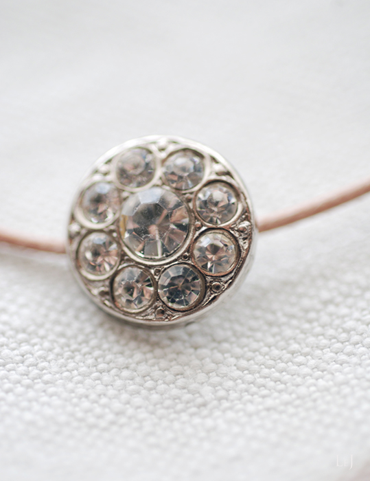 レザーの先には安定しやすいようにパーツを付けているので、フロントに垂らせてもエレガントです。ショートカットの方には、バックに流すと印象的なバックスタイルに。全長106cm。ボタンはラインストーンが埋め込まれたとても可愛いもので、直径12mm。コードに通しただけなので、鎖骨の角度によっては、ボタンが前を向いたり下を向いたりします。その、ちらちらとした輝きは、とってもキュート。