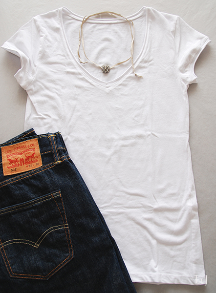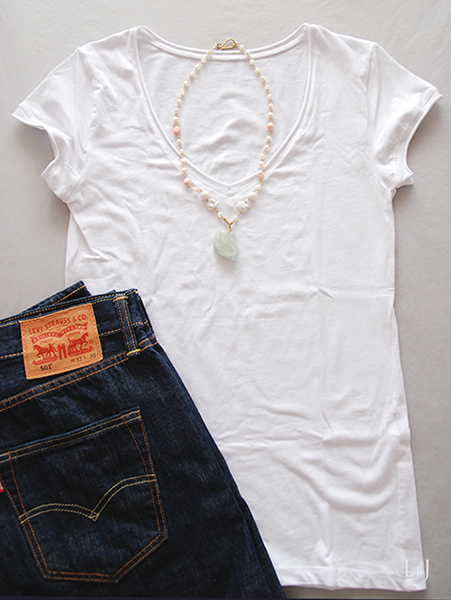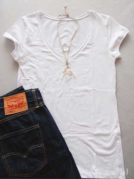 軽いタッチのもの、素材にこだわり選び抜いた大好きなもの、新しく定番にしたいものもあります。そのなかで、コーディネートしやすい白いTシャツとデニムに合わせて、アクセサリーを撮ってみました。TシャツはZARA、デニムはリーバイス。どちらも私が普段着ているものです。この夏には、さらにフランスでプレゼントされたコンバースのハイカットを合わせて、王道を行ってみました(笑)