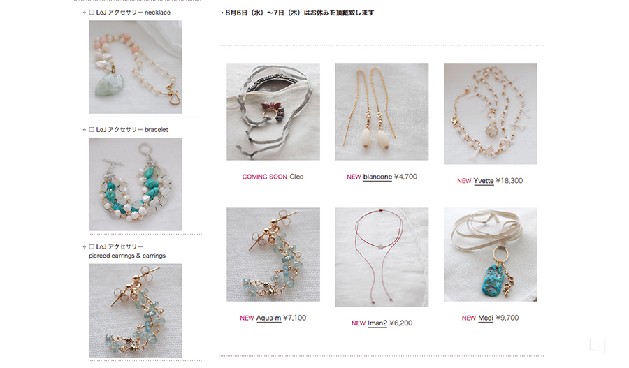 LeJ のホームページ の構成を変えて、トップページの左サイドバーに ネックレス・ブレスレット・ピアス それぞれのページへのリンクを置きました。また、Applejamから再制作を続けているアクセサリーへのリンクも、一番下に置きました。このように、ページへのリンクは4種類になりました。