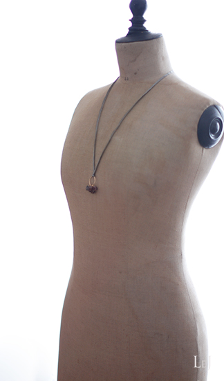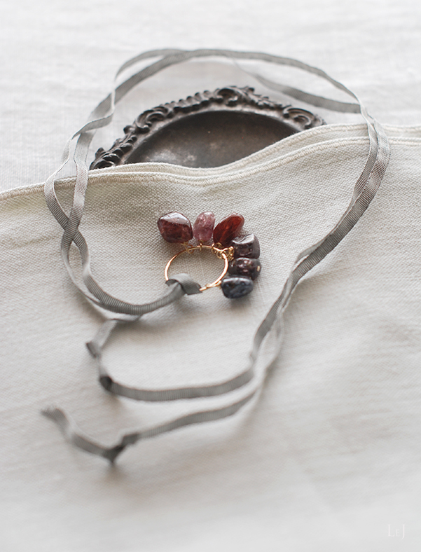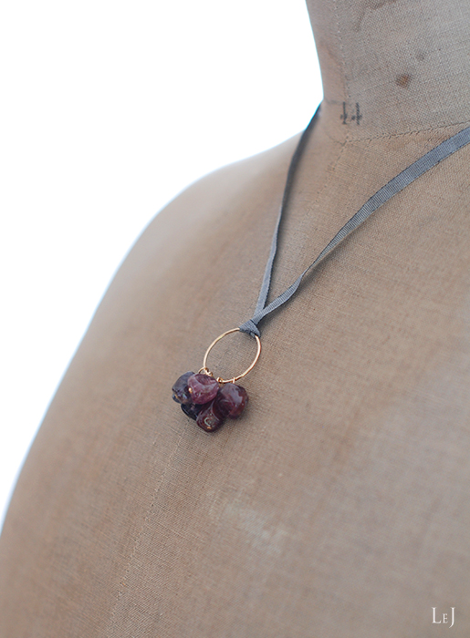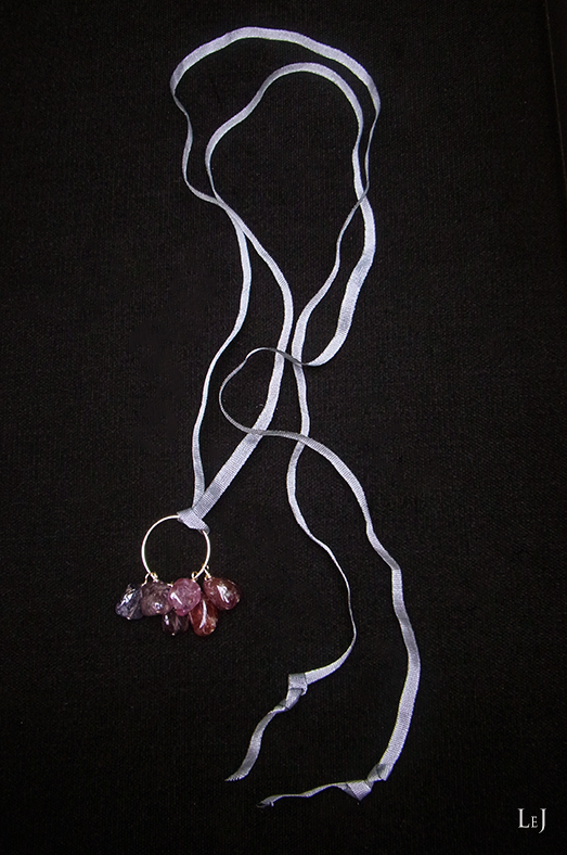 リボンは、ここのところ数点制作しているパリで買い求めたもので、グレージュの色違いの、ほんの少しブルーにころんだグレイ。スピネルのミドルトーンがよく映えます。キラキラやぴかぴかの素材にはない、かすれたような風合いが魅力のネックレスになりました。
