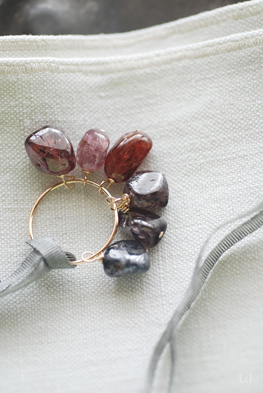 ラフタンブルのスピネルを、14Kゴールドフィルドのリングに留めて、連なるキャンディのようなネックレスにしました。