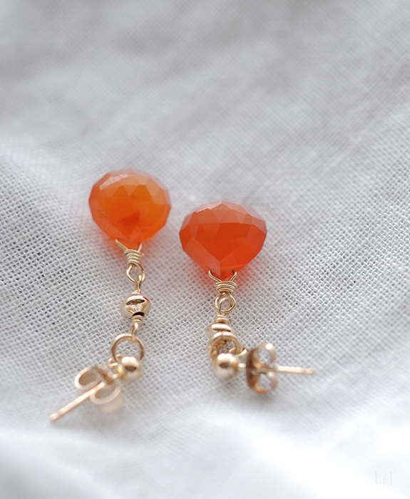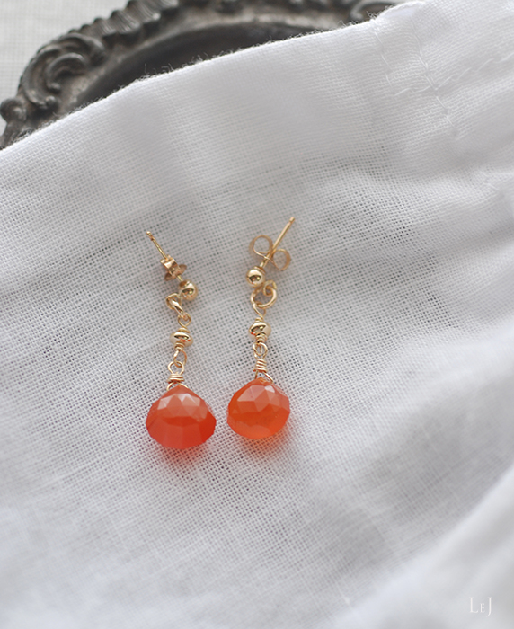 オレンジのピアスは、カーネリアンと14Kゴールドフィルドパーツで作ったもの。この、カーネリアンのカットがとても丁寧で綺麗、発色も良くて好感が持てる素材です。
