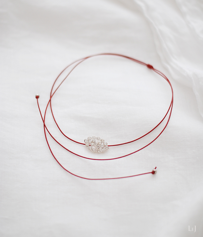 LeJでは、時々レッド系のアクセサリーを作ります。クリアレッドのレザーコードで、デコルテにくっきりとしたラインを描くのがとても好きです。今回は、パリの店で買ったボタンを通したシリーズの Iman を作っていますけれど、同じように少し明るめのボタンを通しました。ボタンは25mm×18mm、ほどよくデコルテに納まるサイズで、レザーコードで巻いた部分をスライドさせることで、長さを調整して頂けます。