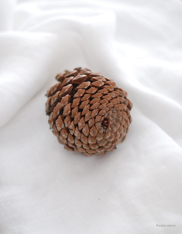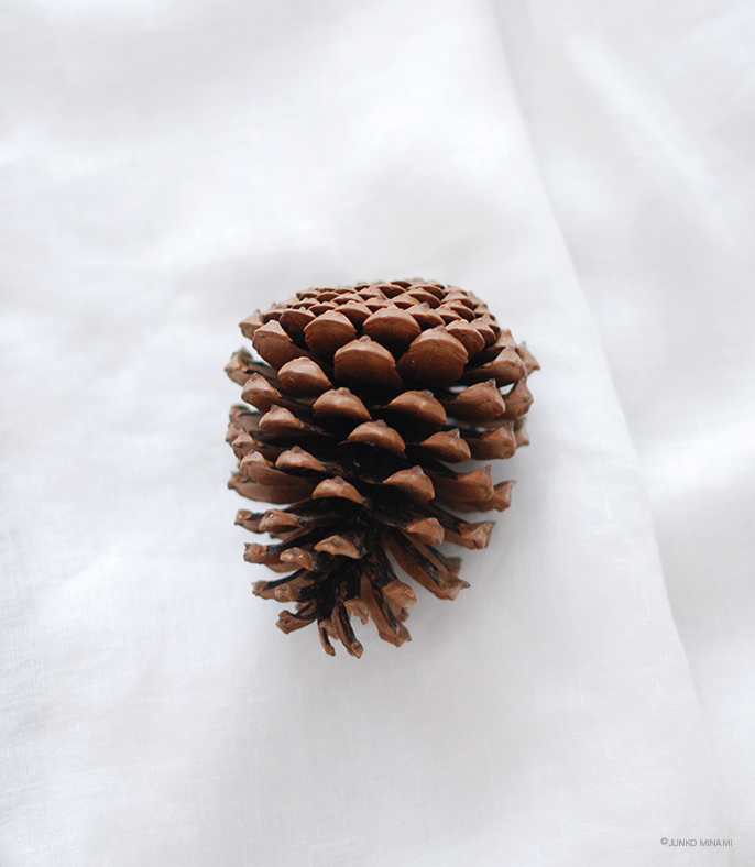 4枚の写真は、その森で見つけた松かさ。日本では見ないくらいの大きさで、友人が見つけて拾い、私に渡してくれました。縦は14cmあって、幅は10cm。最後の画像は私の左手に乗せたものですけれど、手のひらからはみ出すほどの大きさです。それを大切に持ち帰って洗うと、松かさは水分を吸ってちゃんと一度すべてを閉じて、乾くと再びこのように開くのでした。とても硬くて丈夫、まるでお守りのようです。部屋の印象を決めている、アンティークの大きな鏡の前に置いています。