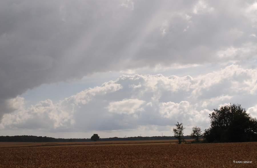写真を撮った日、カメラを持って夕方の散歩に出ました。ちょっと雲行きが怪しいねと話していましたが、1時間近く歩いたところで雨になりました。家はまっすぐ野原の先に見えているのですが、雨宿りの場所もなく、かなりの距離。結局はブルゾンのフードをかぶってカメラを雨から守り、走るのも諦めて、雨の中を歩きました。日本でこんな風に濡れていたらかなり目立つことでしょうけれど、フランスでは、よほどの強さでなければ傘もさしません。