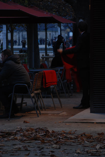 写真は、テュイルリー公園で撮ったもの。少し暗めなのですが、温かそうなバーミリオンのブランケットが素敵でした。パリへは、フランスに大きな変化がなければ、今のところは予定通り発とうと考えています。
