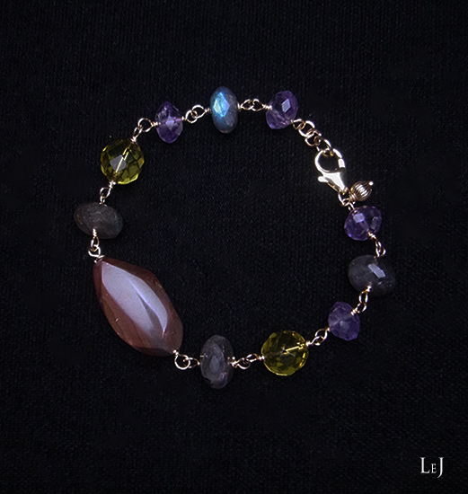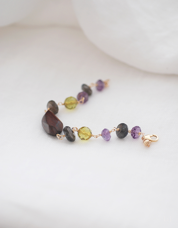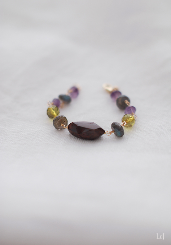 何年も前に一目惚れしてストックしていた、ローライトという天然石をセンターに配しています。センターからストーリーが広がるように配したのは、ラブラドライトやグリーンアンバー、アメジストなどの、美しいカットのファセッテドラウンデル。何度か箱から出しては「いつか使える時が来たら」と思っていたローライトが、しっくり合いました。14Kゴールドフィルドパーツが落ち着いた華やかさを添えています。