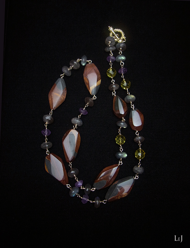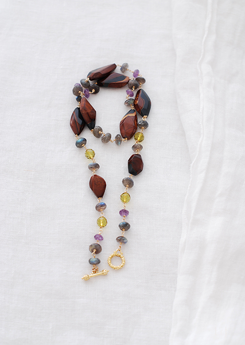長さ67cm。ローライト、ラブラドライト、グリーンアンバー、アメジスト、金属パーツは14Kゴールドフィルドとヴェルメイユ。