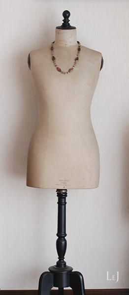 モダニズムとアンティークが女性のデコルテを彩る。個性煌めくカットの天然石に、どっしりとしたバウハウスの家具の色のようなローライトが溶け込むネックレス。初冬の気配がする頃にLeJが作る、華やぎと温かさに満ちたアクセサリー。作り手としても、とくに好きな一点。