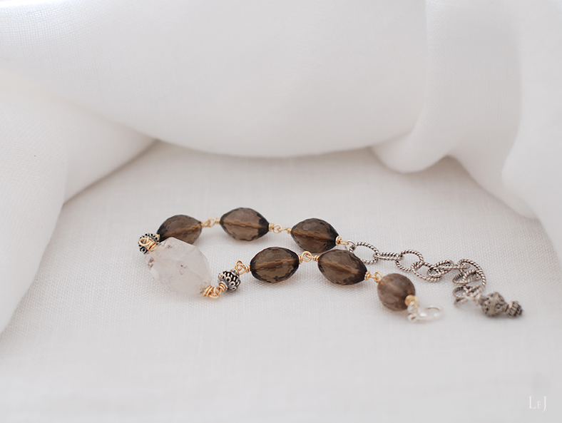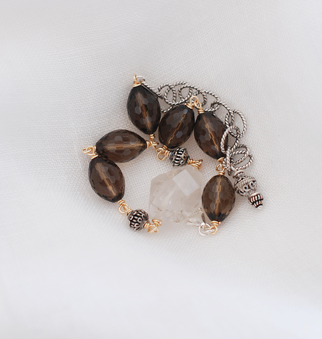 ラフなカットのクオーツをゴールドでとびきりエレガントにして、バレル型に美しいカットが施されたスモーキークオーツをネックラインに。静寂のなかのリュクス、ゴールドとシルバーと天然石素材が共鳴し合うアクセサリーが出来ました。