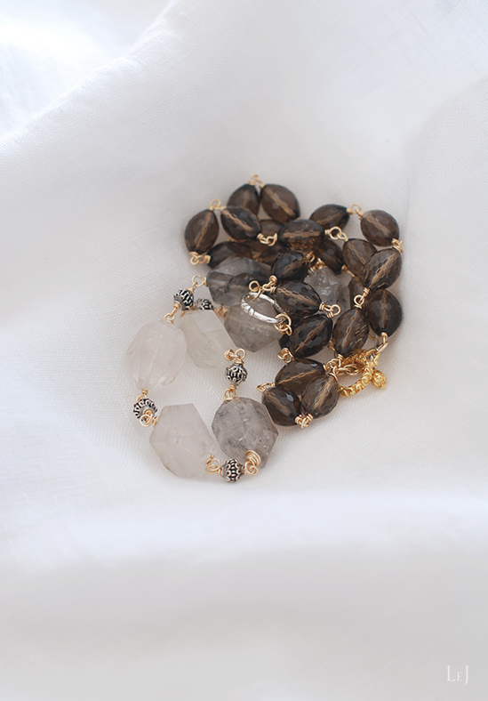 普段は引き立て役になりがちなスモーキークオーツが目映い美しさのカットを施されて、マンガンを内に抱いた、深い世界を持つようなクオーツを受け止める役になりました。クラシカルなシルバー925パーツやゴールド色とシルバー色の金属パーツが溶け合った、心あたたまるネックレスです。