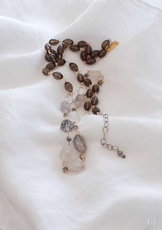 クオーツをゴールドでエレガントにドレスアップさせてスモーキークオーツを添えた、Isidore(イジドール)ネックレスとブレスレットのアクセサリーページを作りました。