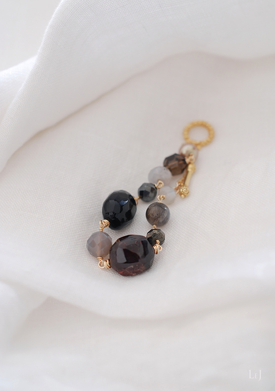 ガーネットのブラッディーレッドやとろみのある大粒のサファイア、この小さな世界を象徴するようなグレイキャッツアイに加えて、センターに配したオプシディアンは、何年も前に買って手元に置いていた素材。ネガティブな感情から着ける人を守る、精神を支えるということを聞いたことがあります。
