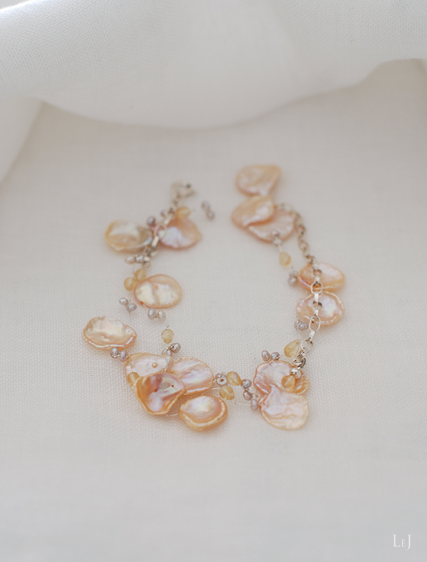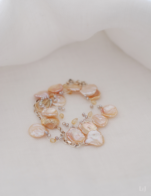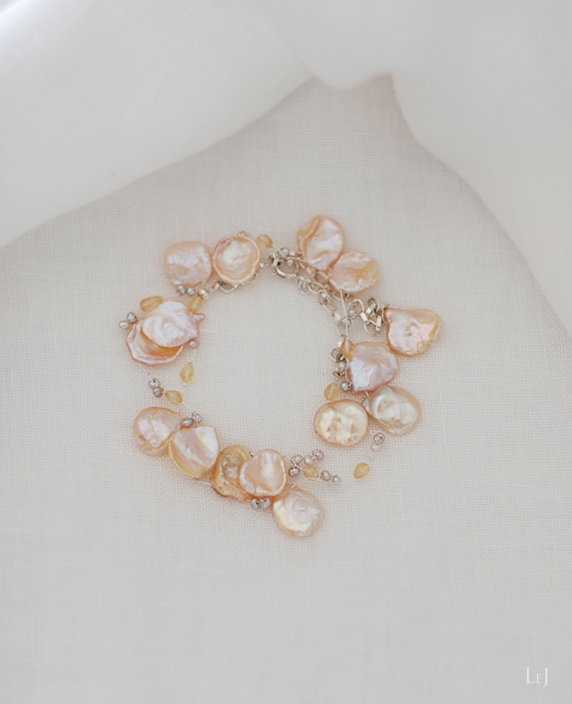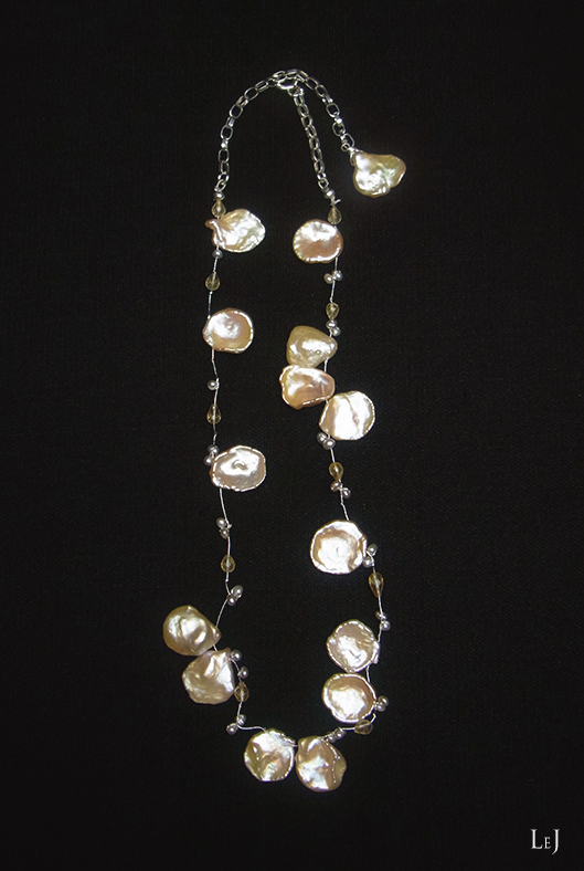 プラチナシルバーの小さなパールや繊細なカットのシトリンのブリオレットと一緒に結び留め、イメージした通りの、パールの上質感を活かしたアクセサリーになりました。37cmから、アジャスターの部分43cmまで、ネックラインに合わせて調節して頂けます。金属パーツはシルバー925。さらにアジャスターを長くするご希望も承ります。そして、リストに巻けば、落ち着いた光をいっぱい湛えたブレスレットに。