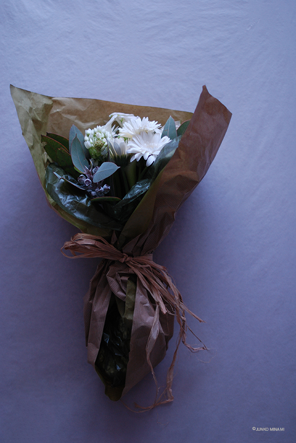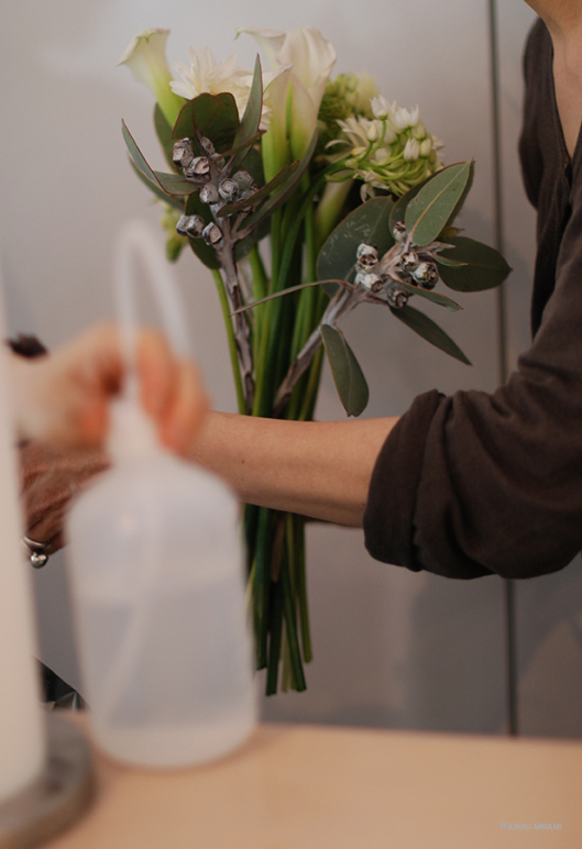 大きなブーケを作って下さる時の、その、花をいためない見事な動きは職人そのものでした。シンプルな白とグリーンの色遣い、あるがままの花の色をのびのびと活かすブーケには、生命力が漲るかのようでした。大きな包み紙はやさしく素材を包み、リボンは主役を邪魔しないのでした。美しい所作でした。