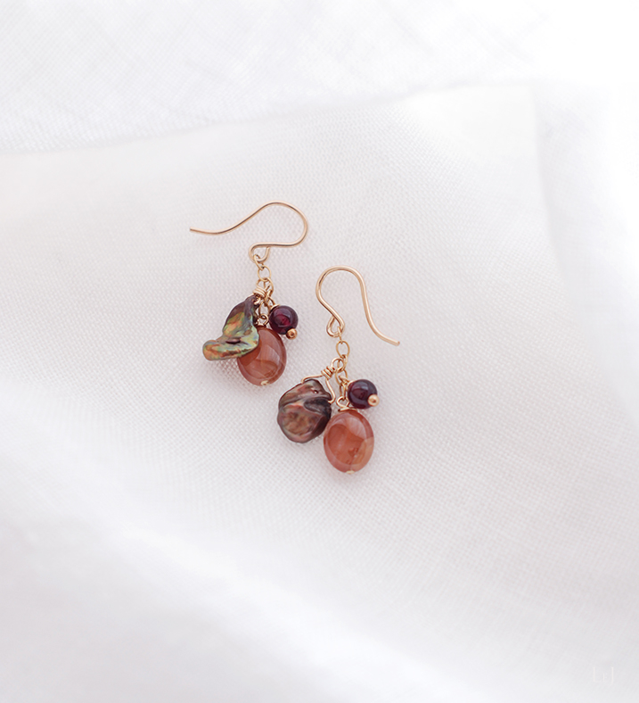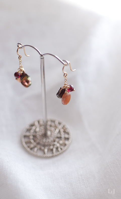 LeJでは、比較的おとなしくサイトに残りがちなアクセサリーがピアスです。ブレスレットは、お客さまがすぐに見つけて下さいます(笑)このピアスは、まだまだ寒いなかに、光を集めた一瞬、ガーネットがほんのり光を灯します。金属パーツは温かみのある14Kゴールドフィルド。