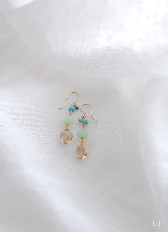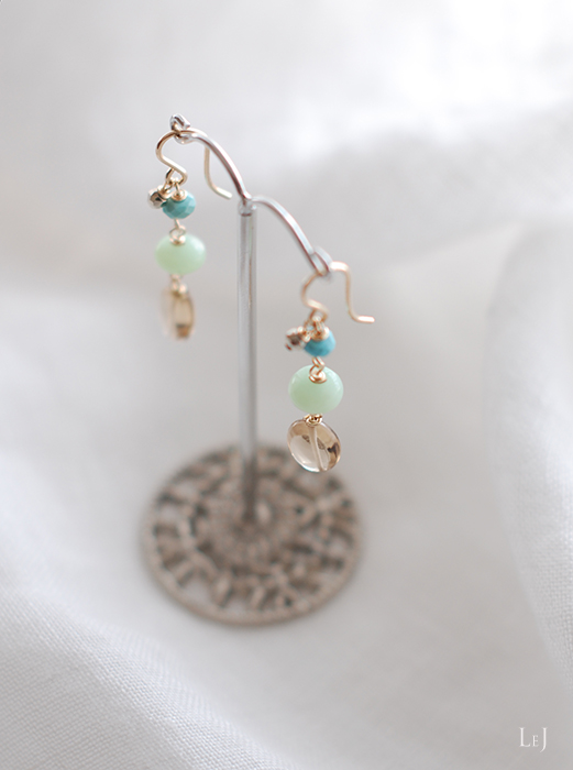 数年前に作ったピアスに、シャンパンクオーツの美しいものを買うことが出来たので、アリゾナターコイズとパイライトを添えて作ったピアス、名前は Coralie(コラリー)。