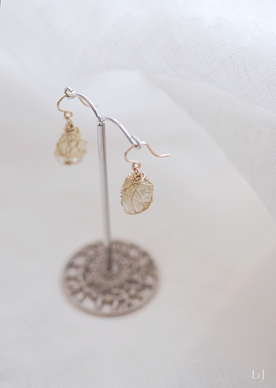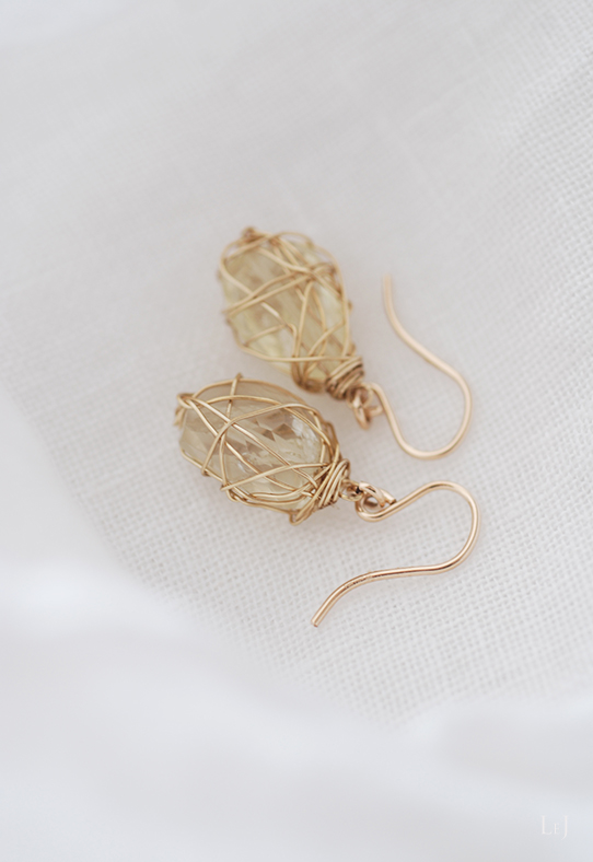 春のひかりを集めたレモン色のクオーツをワイヤーでドレスアップ。ピアスの名前はIèna(イエナ)。