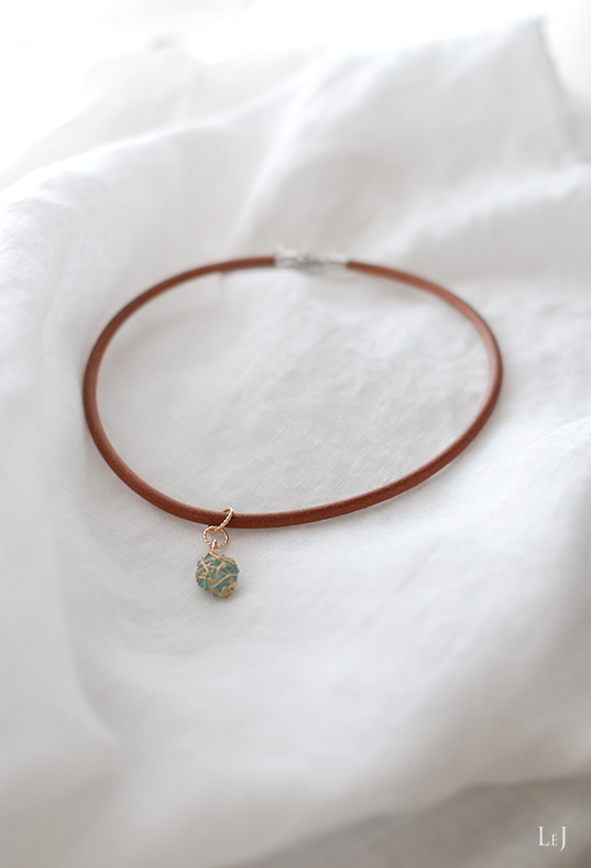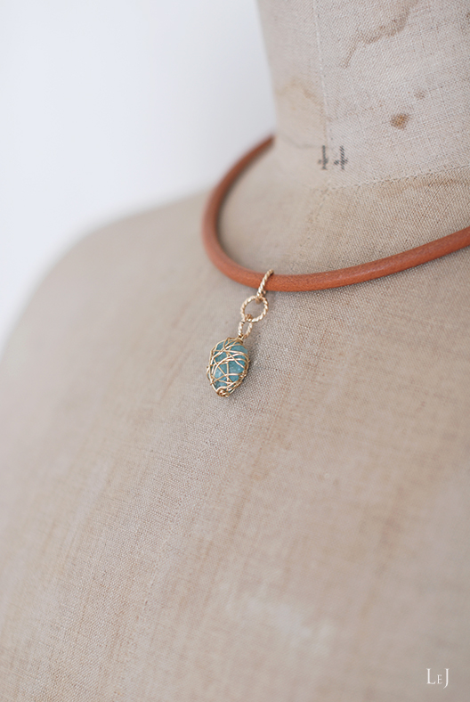 フォレストグリーンのアクアマリンを大切にワイヤーでくるんで、レザーネックレスのセンターに。Domitilla(ドミティッラ)と言う名前の、春に向かう季節のネックレスです。