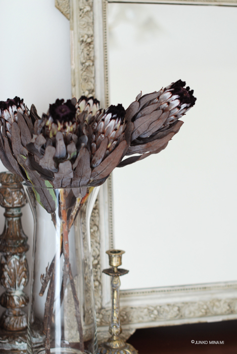 持ち帰ったのは良いのですが、合う花瓶が見つかるまでまた数日掛かりました。その間にも、この花は水もなしに開き始めました。ドライにしたいので水を入れていないのに、ゆっくりゆっくり咲くその姿にはどこか静かな迫力を感じます。