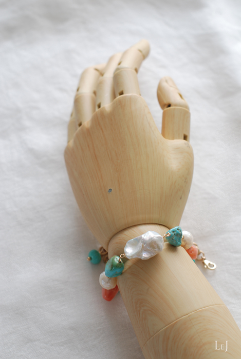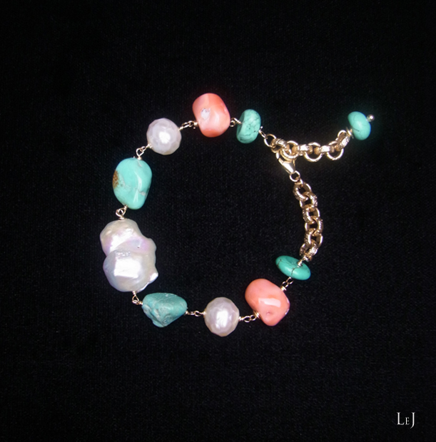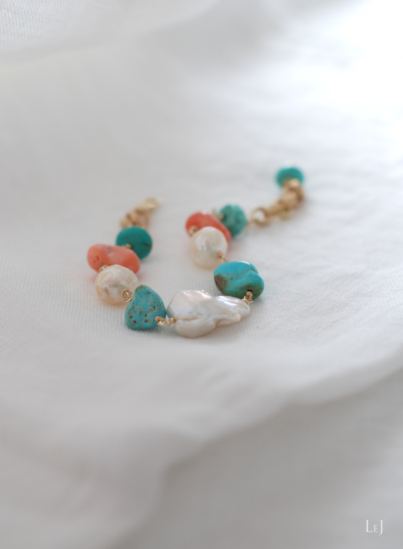 バロックパール、エメラルドバレイターコイズ、カットパール、天然珊瑚、メキシカンターコイズを使い、14Kゴールドフィルドとアーティスティック加工した美しいマットゴールドのメタルチェーンで仕上げました。