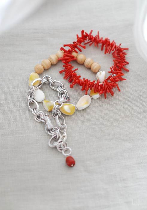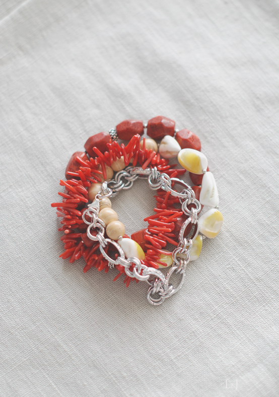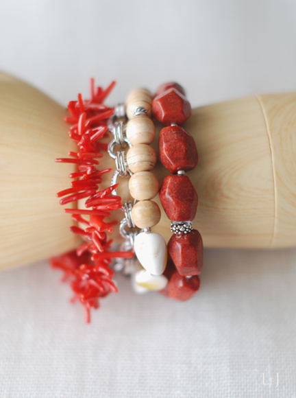 今回はレッドがメイン。コーラルやウッドにシェル、ブロンズをアンティック加工したチェーンを使いました。いつもサイズはやや小さめなので、16cm〜17cmくらいの方にほどよくフィットするように作りました。