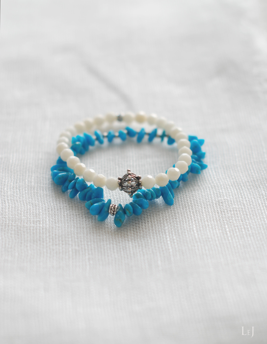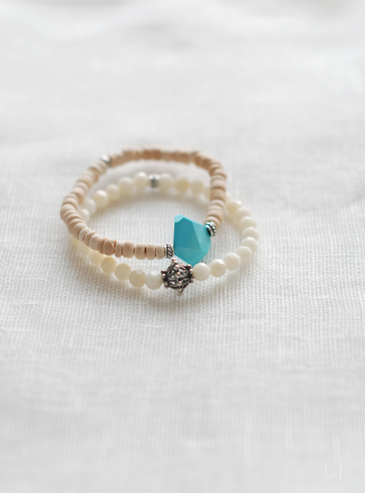 クリアブルーのスリーピングビューティターコイズを温かみのあるベージュのココウッドのセンターに、ホワイトコーラルをリンクする連にして、ブルーコーラルとのブルー系で合わせた3連のブレスレット、Collins(コリンズ)。
