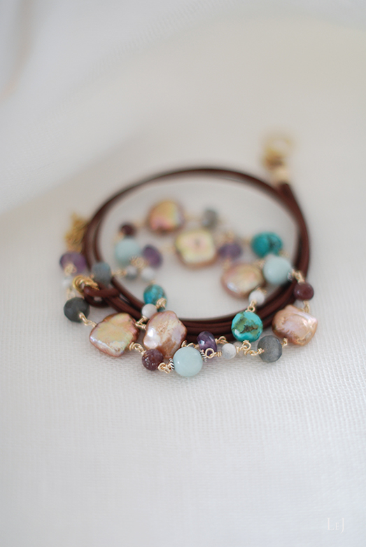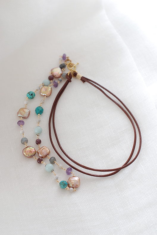 ベビーブルー、グレイ、エクリュ、ターコイズ、ヴァイオレット、そしてふっくらとゆたかなゴールド色を添える10mmスクエアカットのパール。素材のなかに14Kゴールドフィルドやヴェルメイユ、シルバー925など金属パーツをカーフのレザーコードでリンクさせたネックレス、Sully(シュリー)。