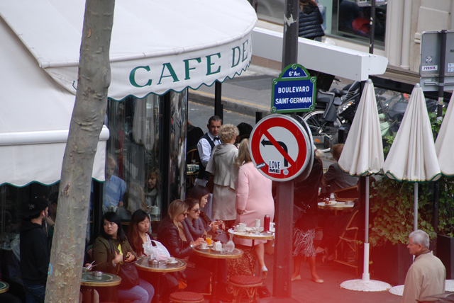 写真は、サンジェルマン・デ・プレにて。素敵なスーツを着こなしたマダムが入るのは、カフェ・フロール。このようなマダムはメトロに乗らず、移動はタクシーかバスのようです。