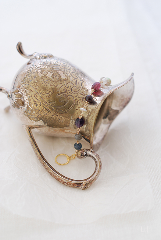 サファイア、ラブラドライト、アメジスト、けしパール、ガーネット、ピンクトルマリン、ムーンストーン、バロックパール、ピンクサファイア、ハーキマーカットクオーツ、ルビー、オレンジガーネット。ほんのすこしのグレイをトッピングしたような素材のアクセサリーになりました。