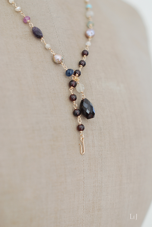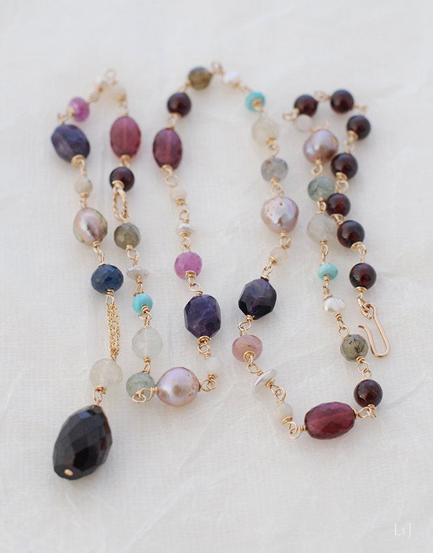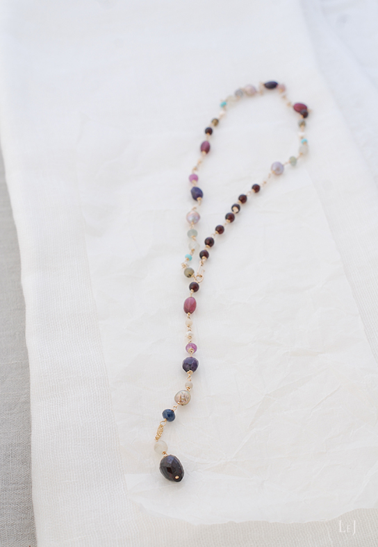 サファイア、ピンクトルマリン、とっておきの美しさのバロックパール、アメジスト、ムーンストーン、アリゾナターコイズ、ガーネット、ラブラドライトなどさまざまなカットやシェイプの素材を集めたY字ネックレス、Letizia(レティツィア)。