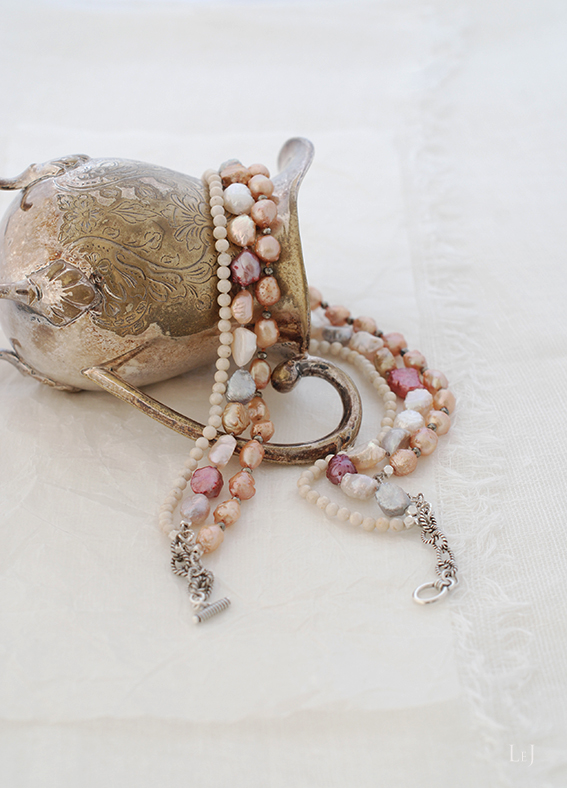 パイライトやリバーストーンがちいさなスパイスになって、そこまで来ているあたらしい季節の光を纏ったかのよう。短い連は47cm、一番長い連は52cmほど。丁寧な造りの金属パーツはシルバー925で、ほんの少しのアンティックテイスト。