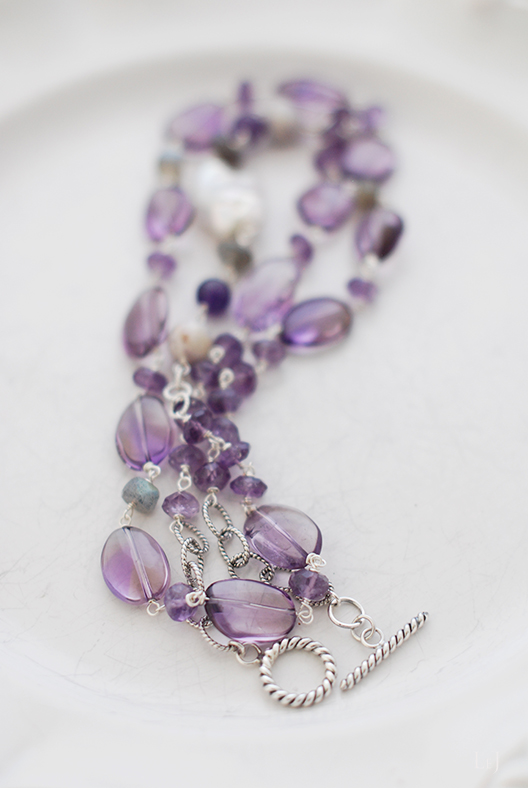 やわらかに光を湛えるラフオーバルのアメジストと大粒のバロックパール、ラブラドライトやチャロアイトをシルバーいろに溶け込ませてネックレスにしました。ラインのなかで使っているロープ形状のシルバー925素材のリングがあたたかみをプラス。