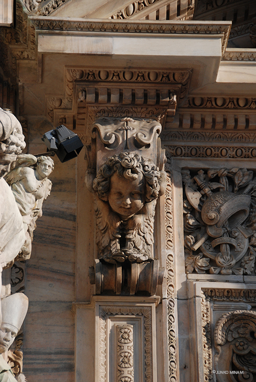 写真は、ミラノのドゥオーモの、ファサードの彫刻。このような細工が表面にびっしり。そばに行くと、なんとも言えない威厳と優しさを感じたのでした。