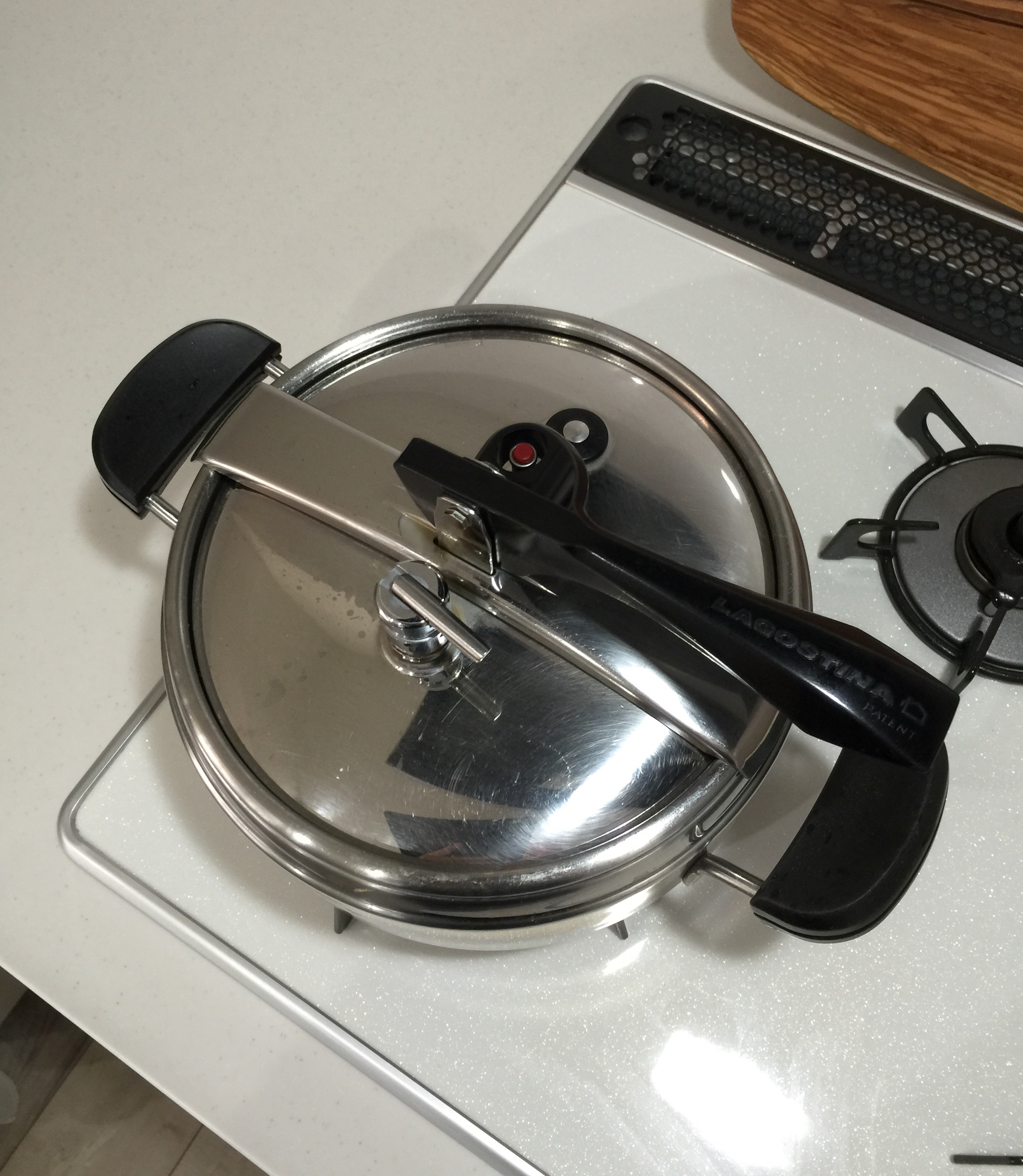 冷蔵庫のなかの食材を集めて、35年間くらい使っているイタリア製のラゴスティーナと言うメーカーの圧力鍋でシチューを作りました。とても丈夫で、あちこちパッキンを替えたりしてメンテナンスしながら使い続けています。購入当時から変わったのはレバーの形だけのようで、今も販売されています。