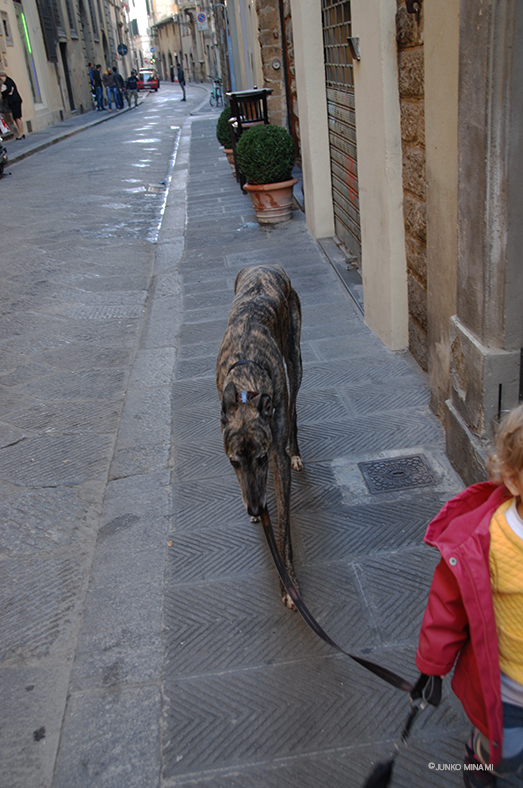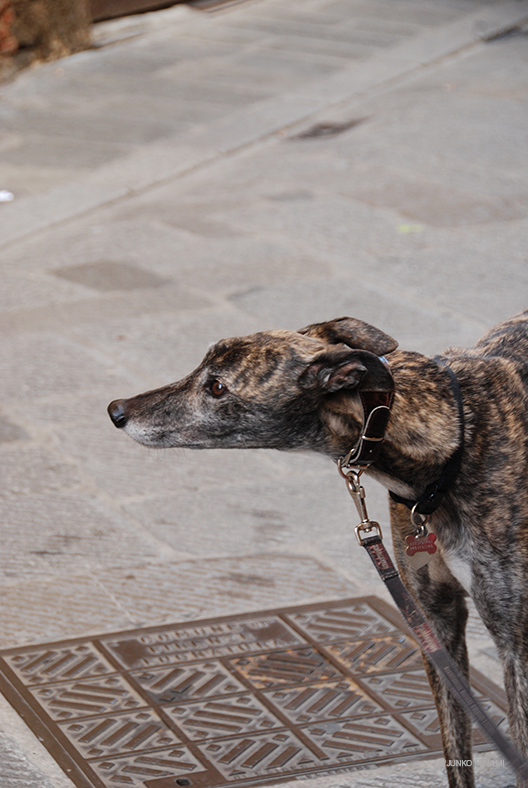フィレンツェの日曜日の朝。サンスピリト広場でのアンティーク市に向かって歩いていたら、この犬を連れたご家族に出会いました。あまりに美しい犬なのでお願いして撮らせていただいたもの。大型犬なのに、とってもシャイ。そして、首輪は「これぞイタリア」。