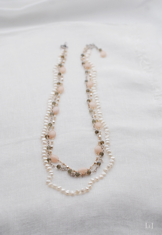 淡いマチエールを持つピンクアベンチュリンとアドリア海を思い出すラブラドライト。ヴェネツィアへの旅の思い。
