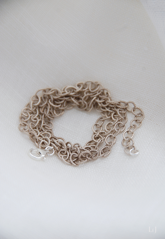 ニュアンスのあるアンティーク加工をしたブラス素材のチェーンでさらさらとした着け心地がとても軽く、リングの表情をそのまま活かします。トーンが強くないのでお洋服とも合わせやすい素材。商品としては、リングを通した際にバランスの良い60cmにして、リングをお求めいただいたお客さまに定番商品としてお届けします。