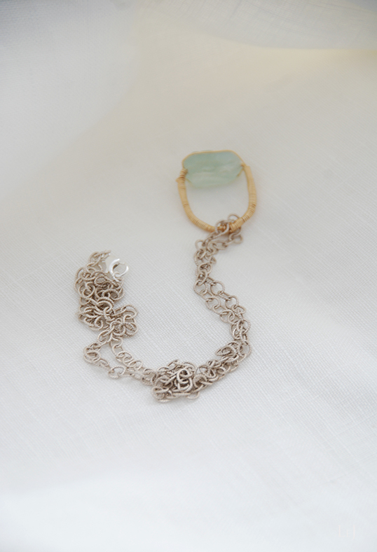 Basil2ネックレスは無彩色に近いトーンで、ゴールドもシルバーもこだわらずにさっとリングを通してお使いいただけます。万一リングが落ちることのないよう、留め具はカニカンを。また、こんなネックレスがお手元にあれば、たとえばボリュームのあるほかのネックレスにレイヤードすることで、逆に、全体の雰囲気を軽くすることが出来ます。