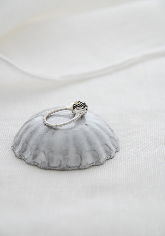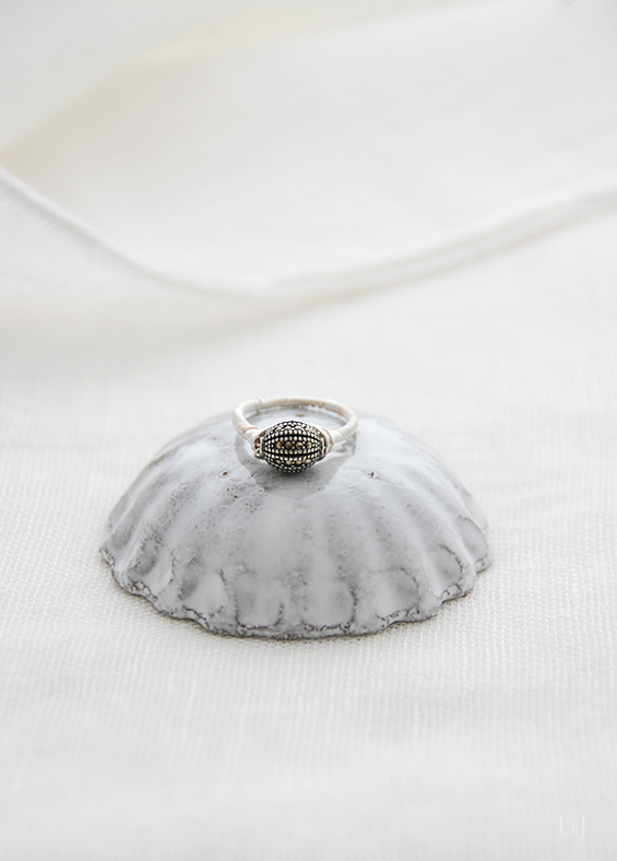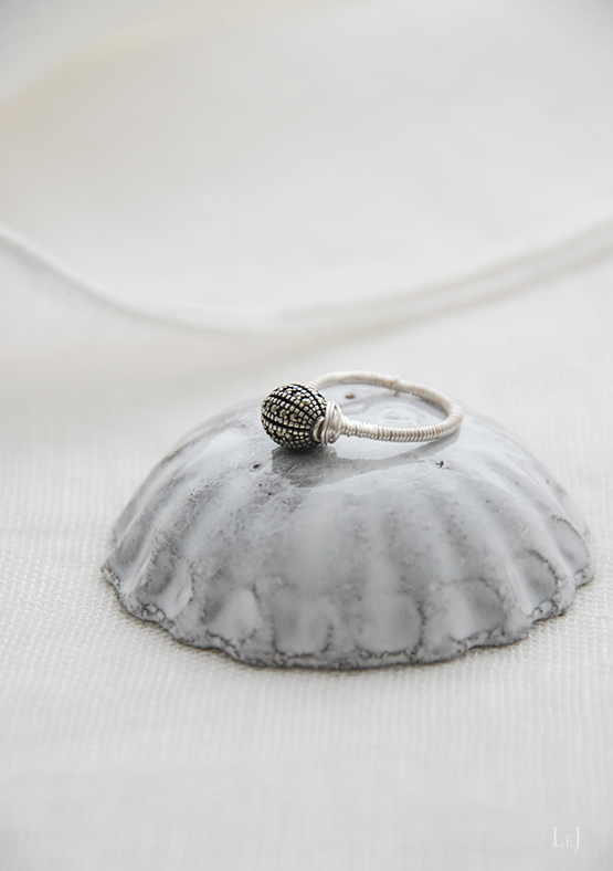 LeJがずっと大切に思っているマーカサイトを秀逸な細工でびっしりと埋め込んだパーツ、明るいシルバー色のアーティスティックワイヤーで丁寧にくるんでリングに。