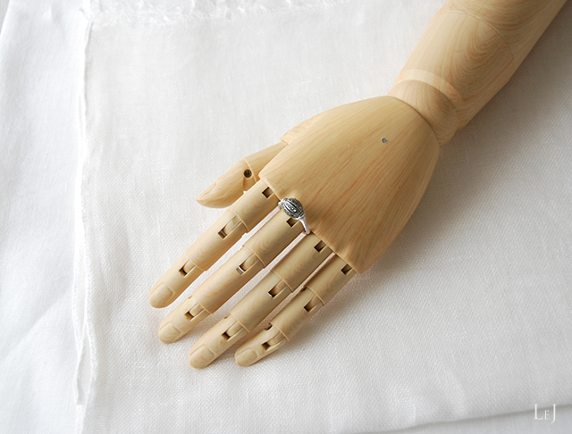 アンティークの雰囲気を持ちながらも、どこかモダンでシャープ、そしてあたたかみも兼ね備えています。サイズ調整に、マリッジリングとの重ねづけもよく合います。リングゲージで計ったサイズ:17〜18号